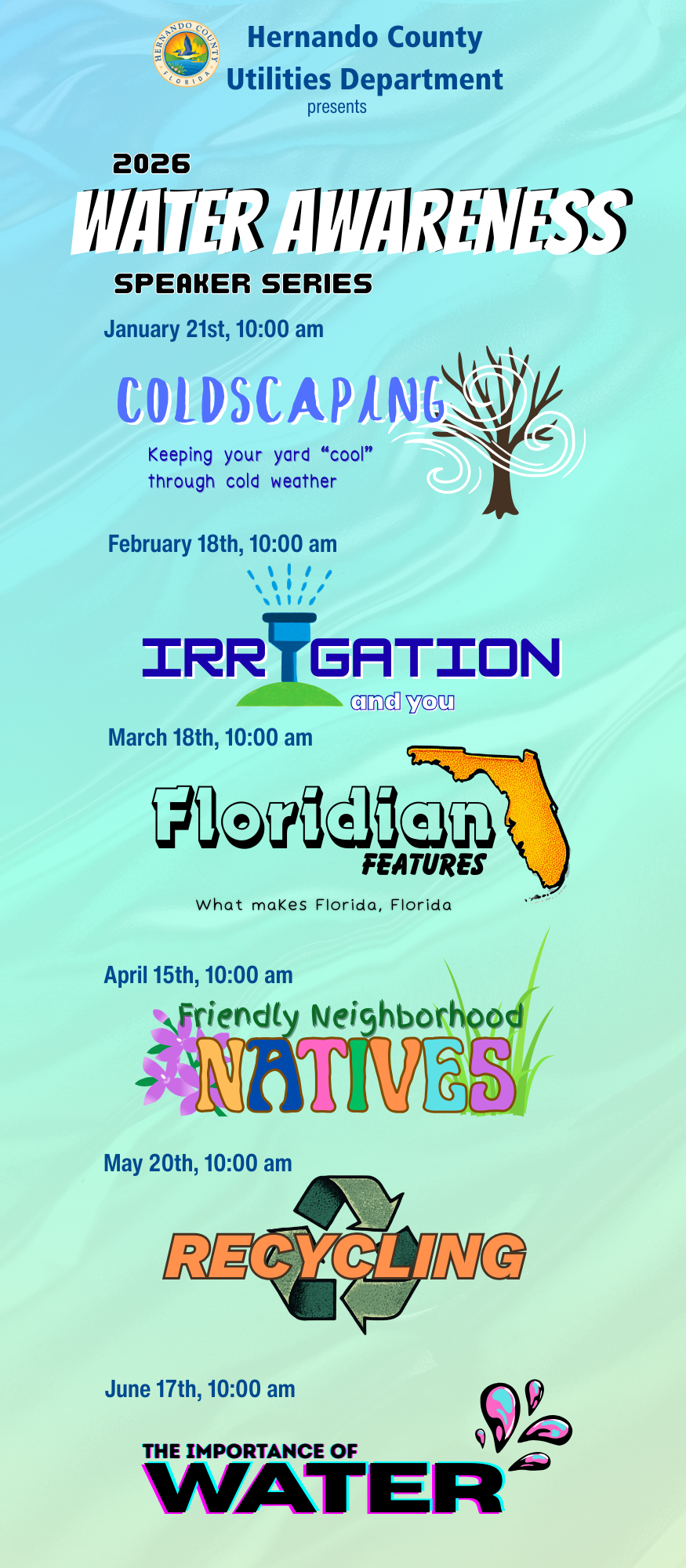 Join us at the Hernando County Utilities Department to hear from expert speakers on a variety of topics related to water!